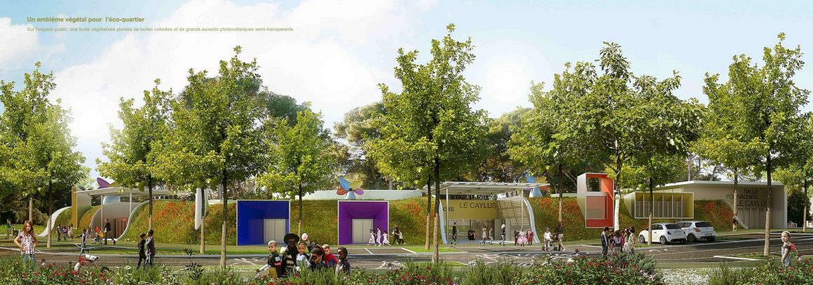 pôle enfance Le Caylus (Castelnau-le-Lez 34) SCHEMASur l’espace public de l’écoquartier Mas de Caylus, le projet propose un bâtiment topographique : une grande butte végétale plantée de graminées, d’où émergent des boites colorées de tailles et de formats divers (où prennent place les châssis vitrés des locaux, les entrées de service) et un skyline de moulins à vent.